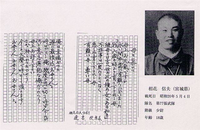 相花少尉の手紙を英語に訳すに当たって、相花の読み方が分からず困っていたところ、このページで初めてわかりました。有難うございます。相花少尉についてもっと何かわかったら、ぜひ此のページでお知らせください。お願いします。涙なしでは読めない手紙です。